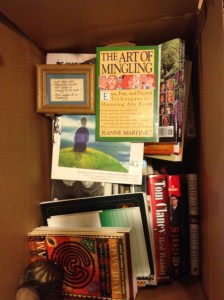 This is just one of the many boxes of books that came out of my office.  Notice “The Art of Mingling.”  One of my daughters gave that to me to help me with all the dreaded Senate receptions.  Unfortunately, it didn’t’ work, but it might one day.  The little framed saying about butterflies is from my Mom’s house.  So tacky, but can’t let it go.